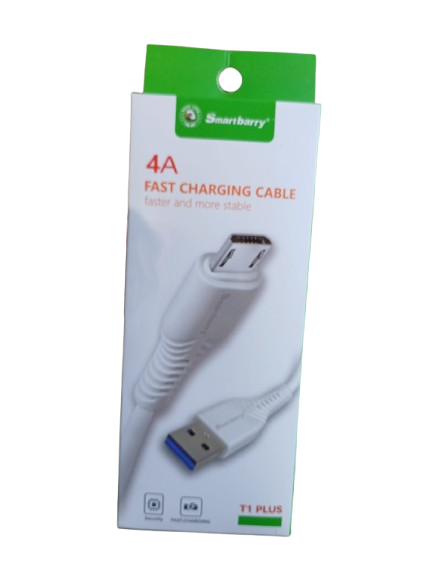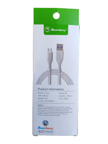 Smartbarry 4A | Fast Charger Cable Faster and more stable Model: T1 USB: USB 2.0 Material: PVC Current: 5V/2.0(MAX) Output: 4A Long line: 100mm Color: White